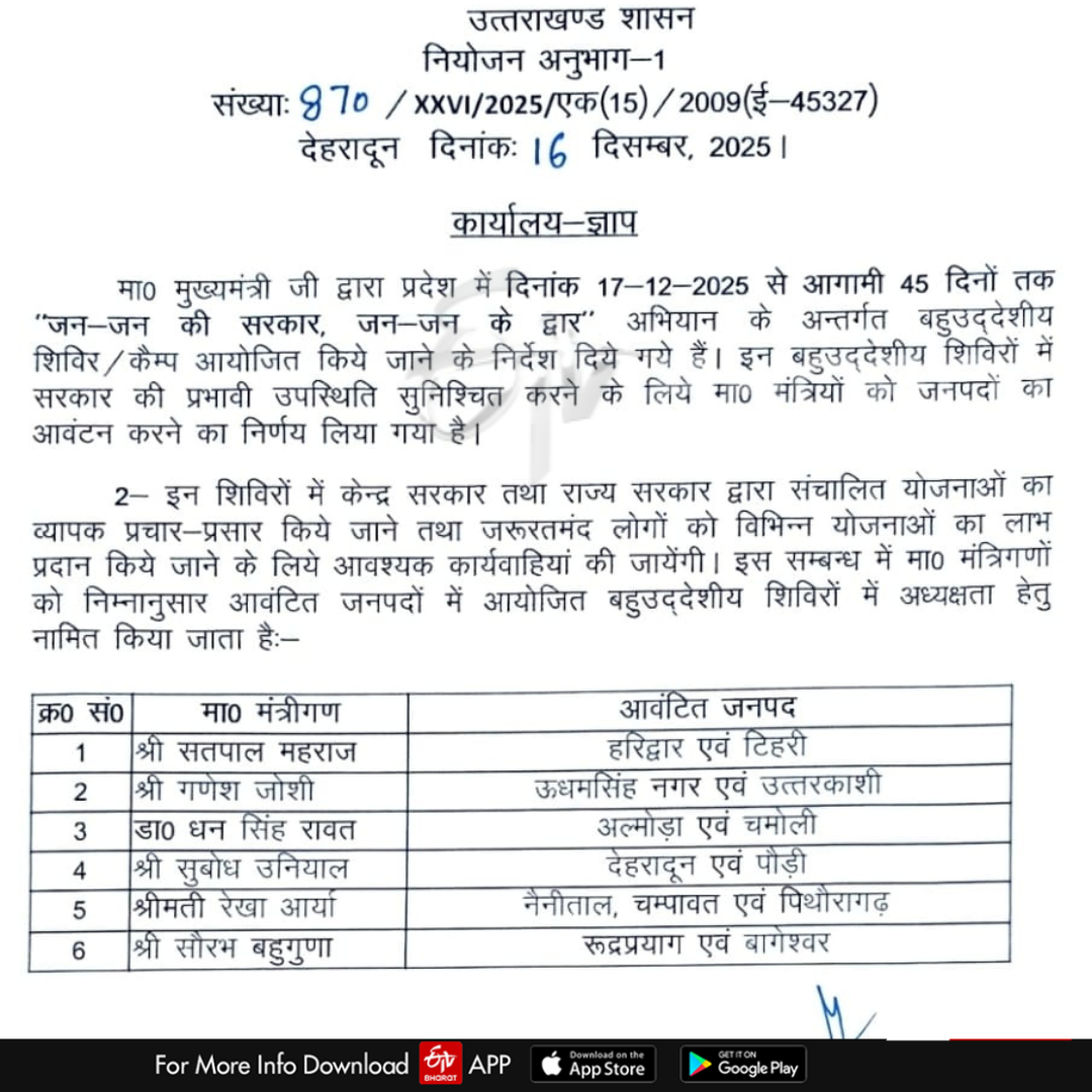 शासन स्तर से इस संबंध में औपचारिक आदेश जारी कर दिए गए हैं। प्रत्येक कैबिनेट मंत्री को दो से तीन जिलों का प्रभार सौंपा गया है, जहां वे 45 दिनों के भीतर कैंप कर जनता की समस्याएं सुनेंगे और फील्ड से सीधा फीडबैक लेंगे।
