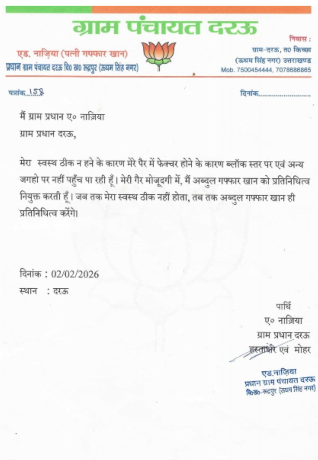 जानकारी के अनुसार, जुलाई 2025 में हुए पंचायत चुनाव में ग्राम दरऊ से भाजपा नेता अब्दुल गफ्फार की पत्नी नाज़िया बी ने ग्राम प्रधान का चुनाव जीता था। आरोप है कि चुनाव के समय वे कोटद्वार में दर्ज तीन मुकदमों में वांछित थीं। बाद में 13 दिसंबर को पुलिस ने उन्हें गिरफ्तार कर जेल भेज दिया, जहां से वे वर्तमान में पौड़ी जेल में निरुद्ध हैं।