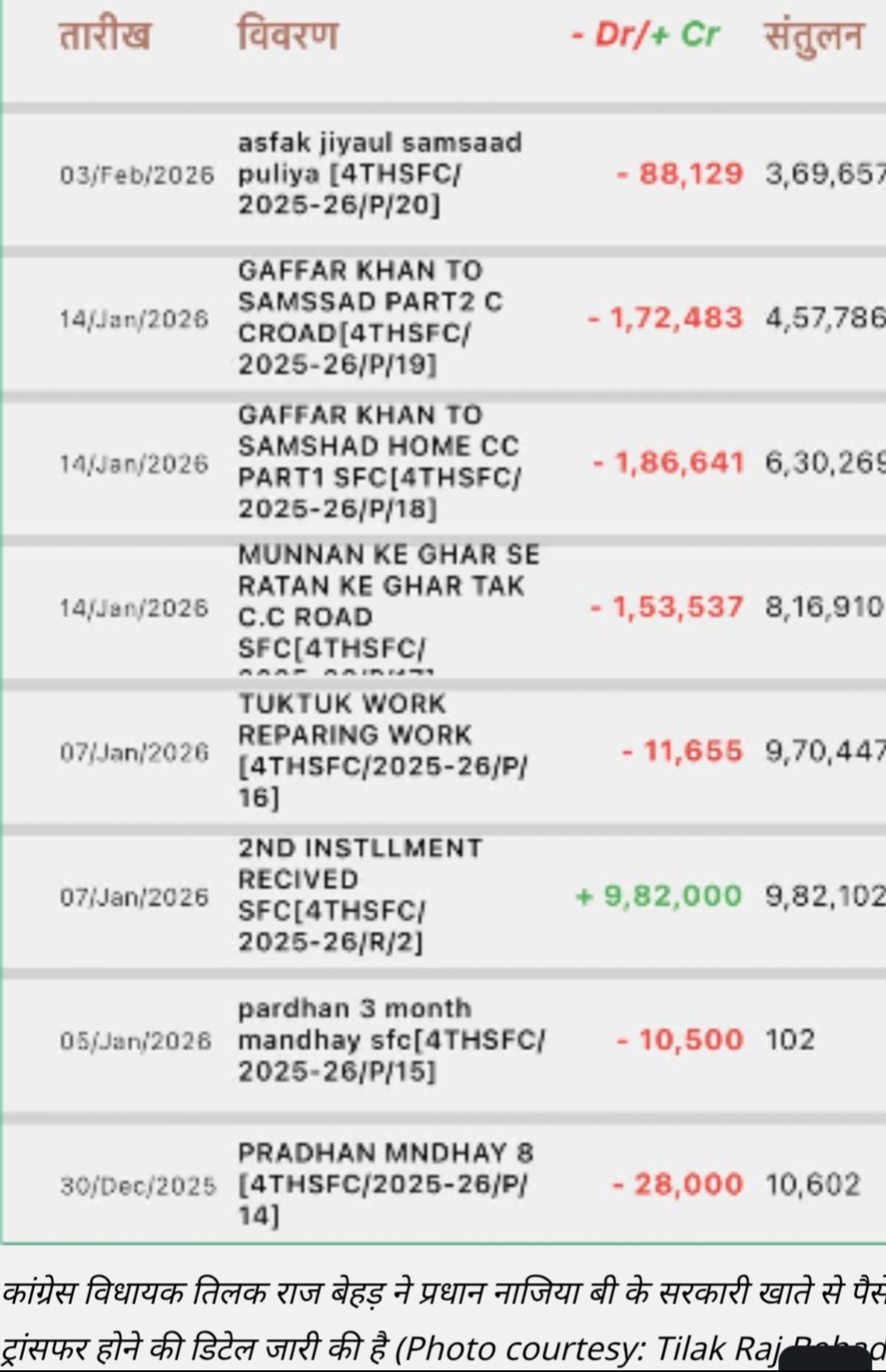 विधायक के अनुसार, प्रधान द्वारा पहले जारी एक पत्र में पैर में फ्रैक्चर का हवाला देते हुए अपने पति अब्दुल गफ्फार को प्रतिनिधि नियुक्त किया गया था। आरोप है कि इसी आधार पर प्रधानपति ने विकासखंड के कुछ अधिकारियों के साथ कथित मिलीभगत कर सरकारी खाते से कुल ₹10.39 लाख की निकासी कर ली।
