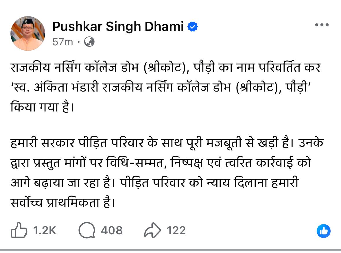 Tags: after late Ankita Bhandari. The decision comes amid renewed demands for a CBI probe into the high-profile Ankita Bhandari murder caseand accountability — Uttarakhand renames Government Nursing College in Pauri after Ankita Bhandari amid growing calls for a CBI investigation.following fresh political developments and public protests across the state.justicePauriremembranceThe Uttarakhand government has officially renamed the Government Nursing College Dobh (Shrikot)