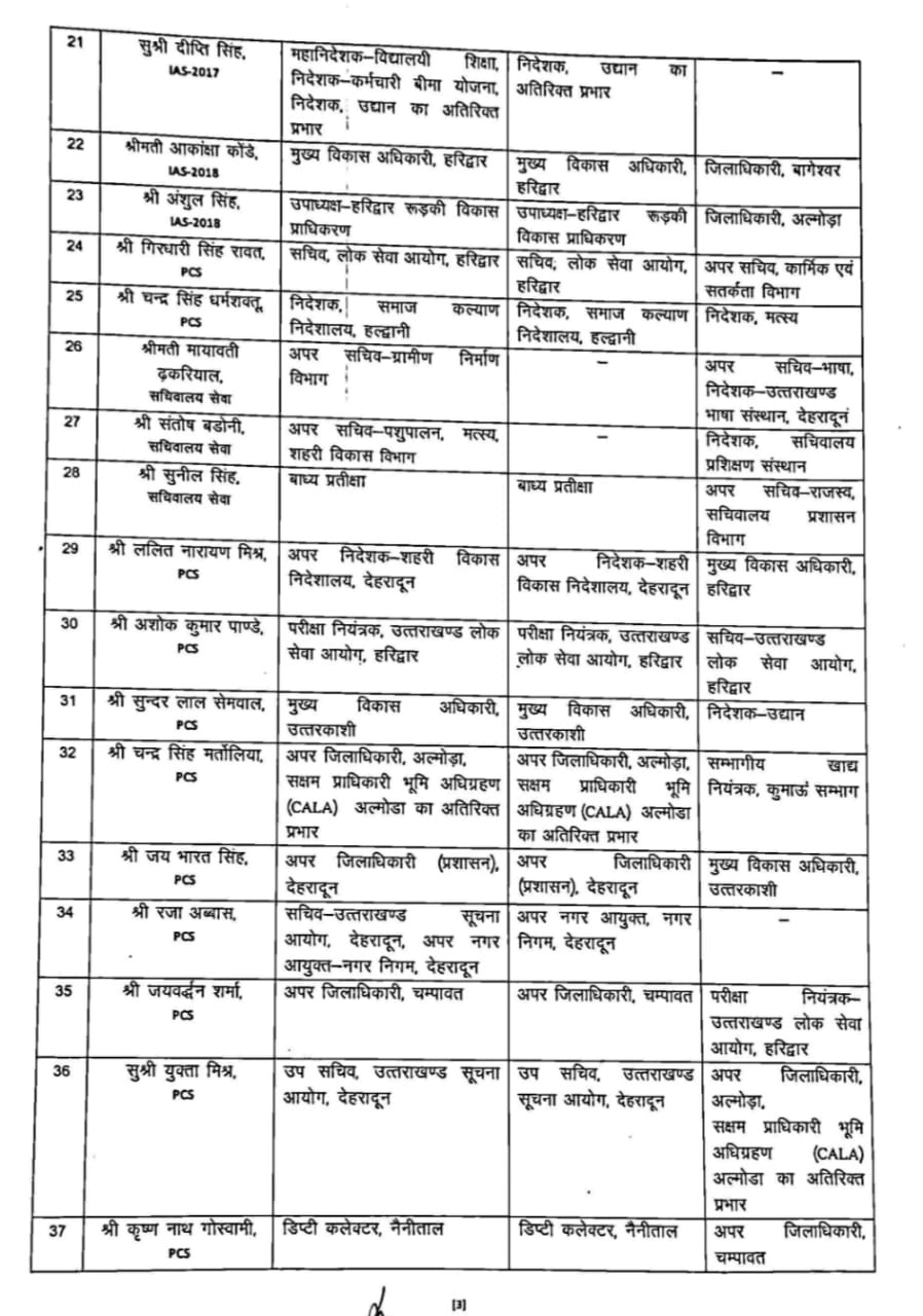 Tags: 1 IFS18 PCS और 3 सचिवालय सेवा अधिकारियों के तबादले किए गए। मुख्यमंत्री पुष्कर सिंह धामी के निर्देश पर संयुक्त सचिव कार्यालय से आदेश जारी हुआ है।उत्तराखंड सरकार ने प्रशासनिक दक्षता और सुशासन को मजबूत करने के लिए बड़ा कदम उठाया है। रविवार को 22 IAS