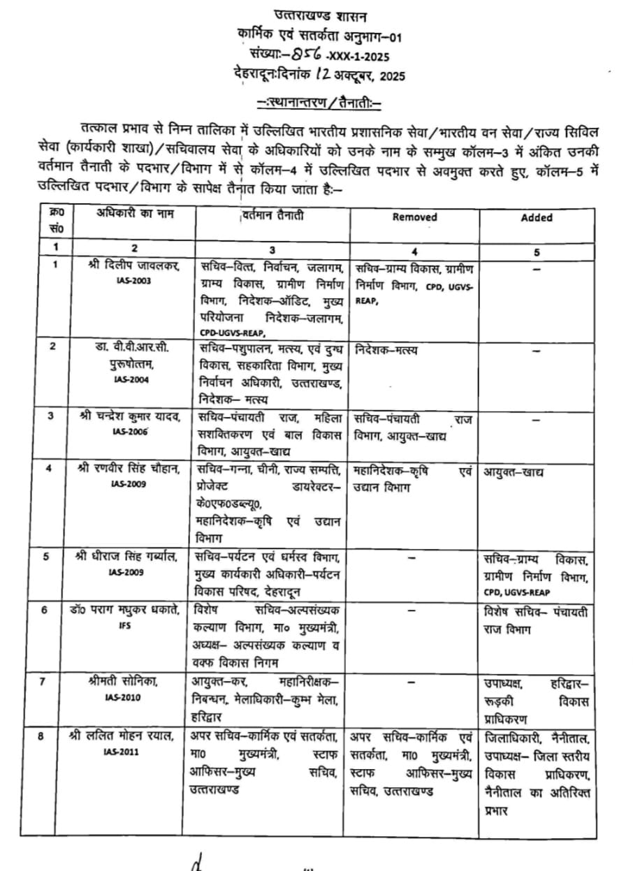 उत्तराखंड में बड़ा प्रशासनिक फेरबदल: 22 IAS, 1 IFS, 18 PCS और 3 सचिवालय सेवा अधिकारियों के तबादले