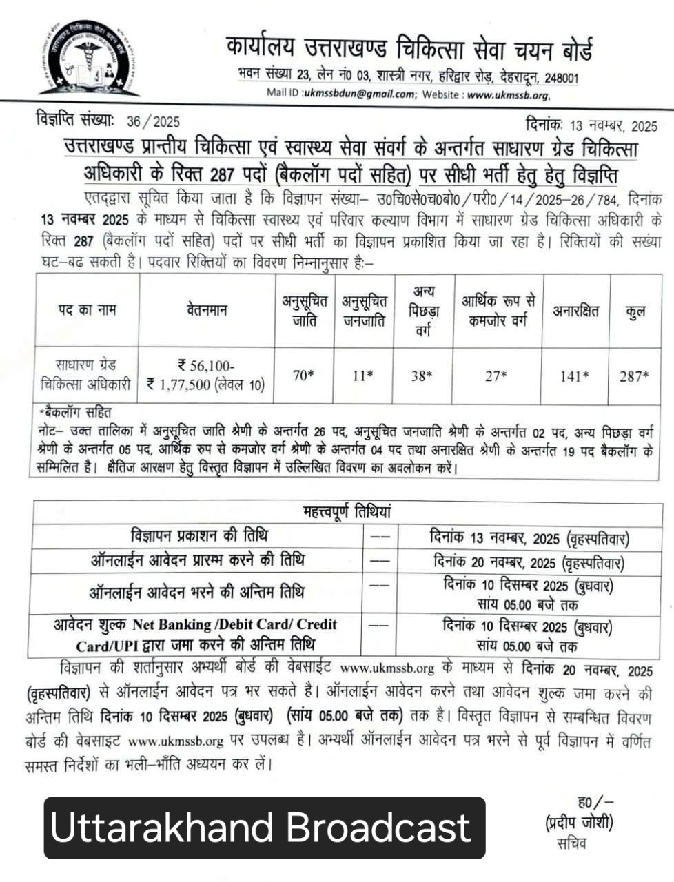 देहरादून। उत्तराखंड चिकित्सा सेवा चयन बोर्ड (UKMSSB) ने प्रदेश के स्वास्थ्य विभाग में साधारण ग्रेड चिकित्सा अधिकारी (Medical Officer) के 287 रिक्त पदों (बैकलॉग सहित) पर सीधी भर्ती के लिए विज्ञापन जारी किया है। इन पदों के लिए आवेदन प्रक्रिया 20 नवंबर 2025 से शुरू होकर 10 दिसंबर 2025 तक चलेगी।