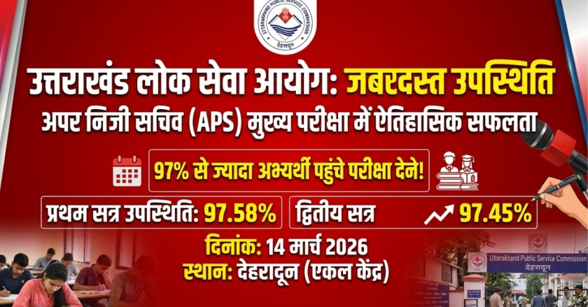 देहरादून | उत्तराखंड लोक सेवा आयोग द्वारा अपर निजी सचिव (APS) परीक्षा–2024 के अंतर्गत मुख्य परीक्षा का सफल आयोजन शनिवार, 14 मार्च 2026 को किया गया। परीक्षा आयोग के एकल परीक्षा केंद्र, देहरादून में दो सत्रों में संपन्न हुई।