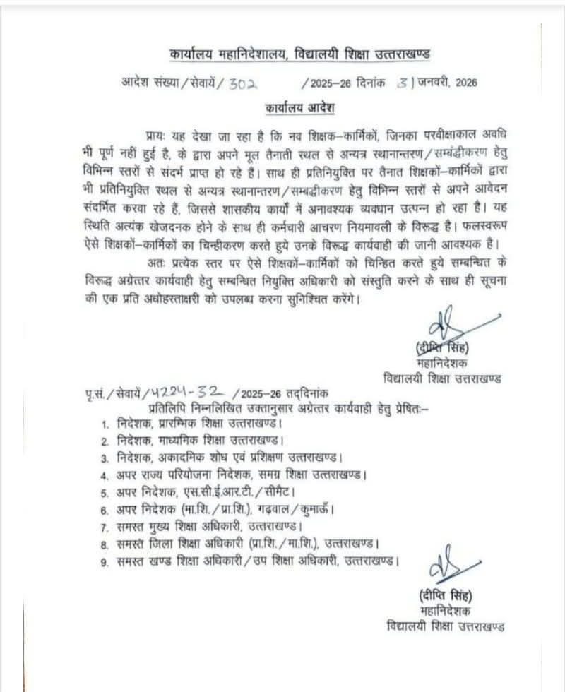 महानिदेशालय द्वारा 3 जनवरी 2026 को जारी कार्यालय आदेश में बताया गया है कि लगातार ऐसे प्रकरण सामने आ रहे हैं, जिनमें नवनियुक्त शिक्षक-कर्मचारी अपनी मूल तैनाती से अन्यत्र स्थानांतरण या सम्बद्धीकरण के लिए विभिन्न स्तरों पर दबाव बना रहे हैं।