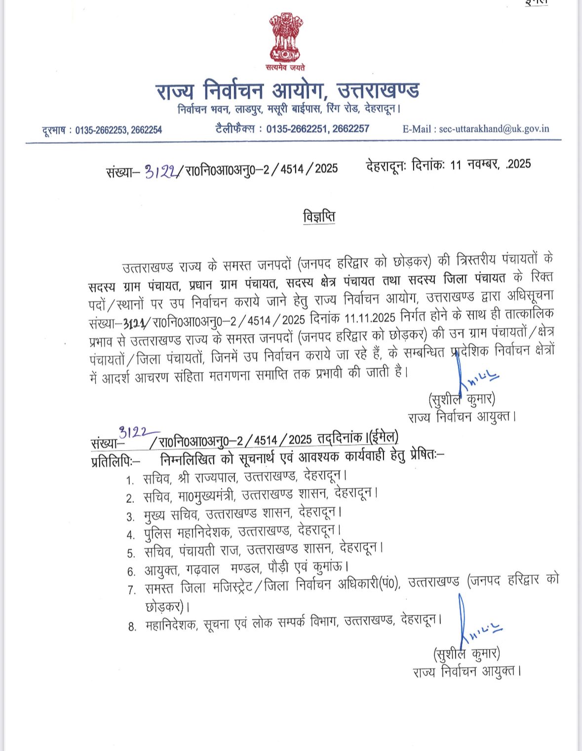 Uttarakhand Election News: पंचायत उपचुनाव की अधिसूचना जारी। इस दिन होंगे उपचुनाव,आचार संहिता लागू