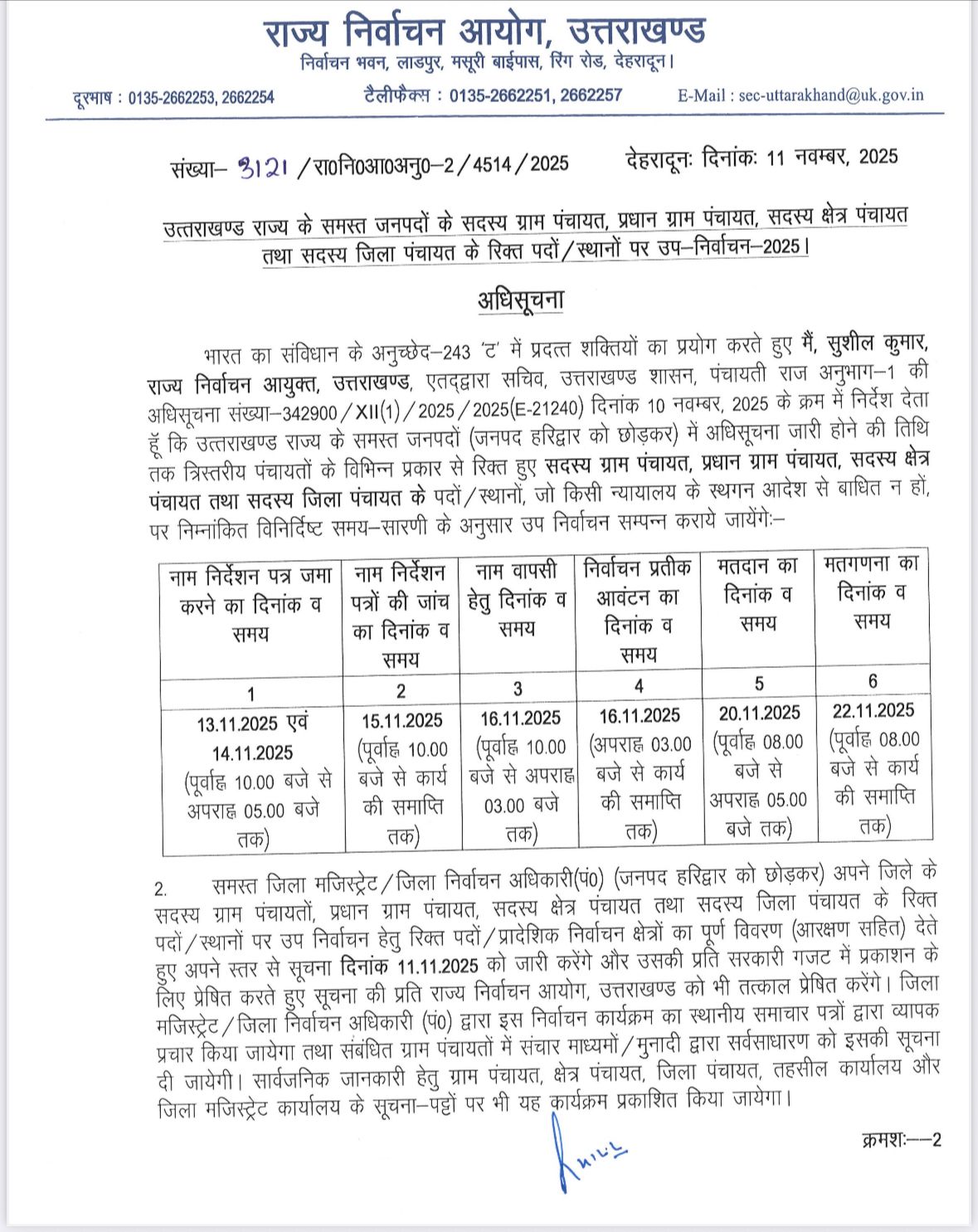 राज्य निर्वाचन आयोग द्वारा जारी अधिसूचना संख्या 3121/रा.नि.आ.अनु.-2/4514/2025 दिनांक 11 नवंबर 2025 के अनुसार, उत्तराखंड के सभी जिलों (हरिद्वार को छोड़कर) में ग्राम पंचायत सदस्य, ग्राम प्रधान, क्षेत्र पंचायत सदस्य और जिला पंचायत सदस्य के रिक्त पदों पर उपचुनाव कराए जाएंगे।
