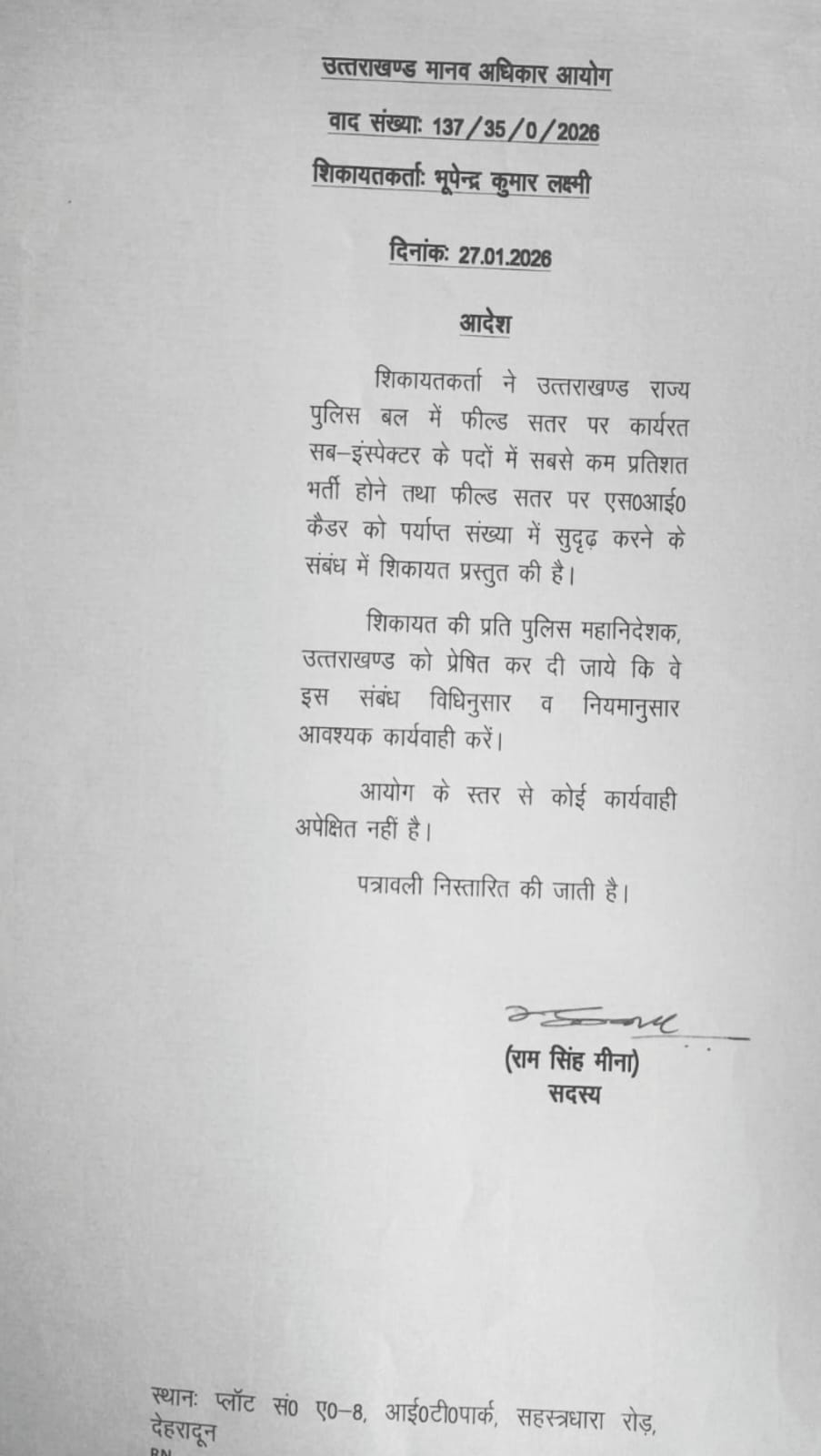 शिकायतकर्ता भूपेन्द्र कुमार लक्ष्मी द्वारा आयोग के समक्ष प्रस्तुत शिकायत में कहा गया कि उत्तराखंड राज्य पुलिस बल में फील्ड स्तर पर कार्यरत सब-इंस्पेक्टर पदों पर सबसे कम प्रतिशत में भर्ती की गई है।